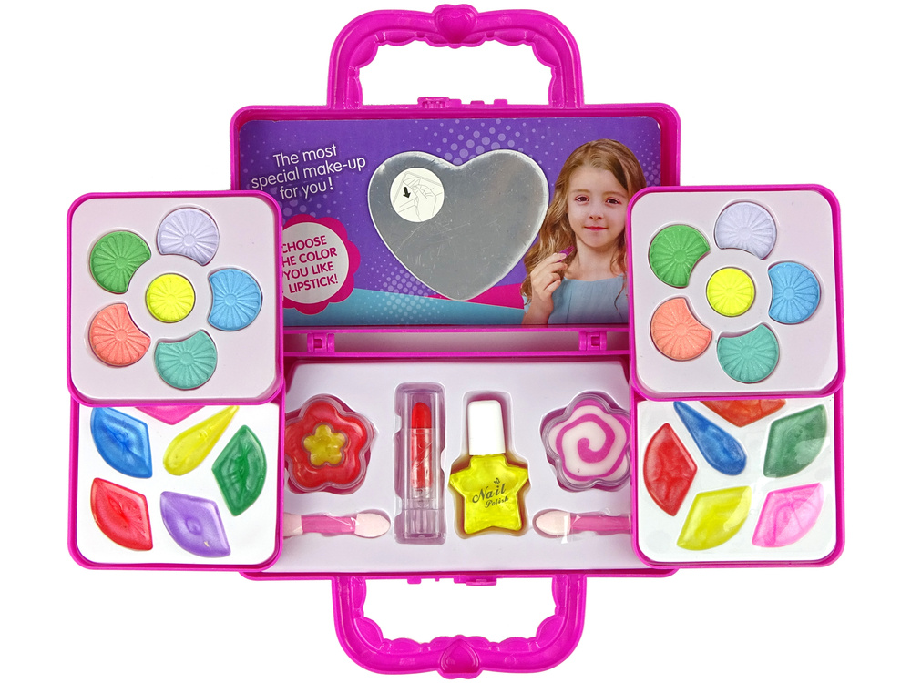 The wonderfully fold-out bag holds many treasures, a range of eye shadows and beautiful glosses. The first layer hides up to 12 eyeshadows. The second layer holds 12 lip glosses and the final layer holds beautiful wonders including nail polish, brushes, two flower-shaped glosses and lipstick. Little girls will have super fun learning the secrets of make-up. And they can check the effect in the heart-shaped mirror.