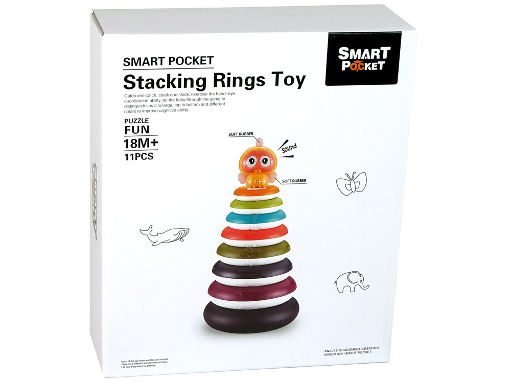 The set consists of several types of rings of different sizes. One possibility is to arrange the rings according to the child's imagination. The yellow duck at the top of the pyramid makes the whole game even more interesting by rattling. Its wings are made of soft rubber, which can be used as a teether. The colourful design with animals will help your child develop and learn about the world around them. The pyramid also features animal images corresponding to the corresponding circles. The toddler can suggest the pictures when arranging the tower.