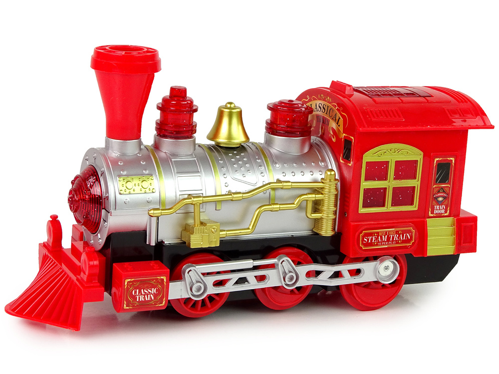 The playing locomotive moves on plastic, rotating wheels - two, smaller ones, are hidden in the underside of the toy. The three wheels on the sides of the toy are decorative elements - the locomotive does not rest on them, but the piston with which they are connected moves spectacularly while the train runs. A great advantage of the toy is that the most important characteristic elements, such as the pistons and the chimney, as well as the sounds accompanying play, have been retained in its construction.