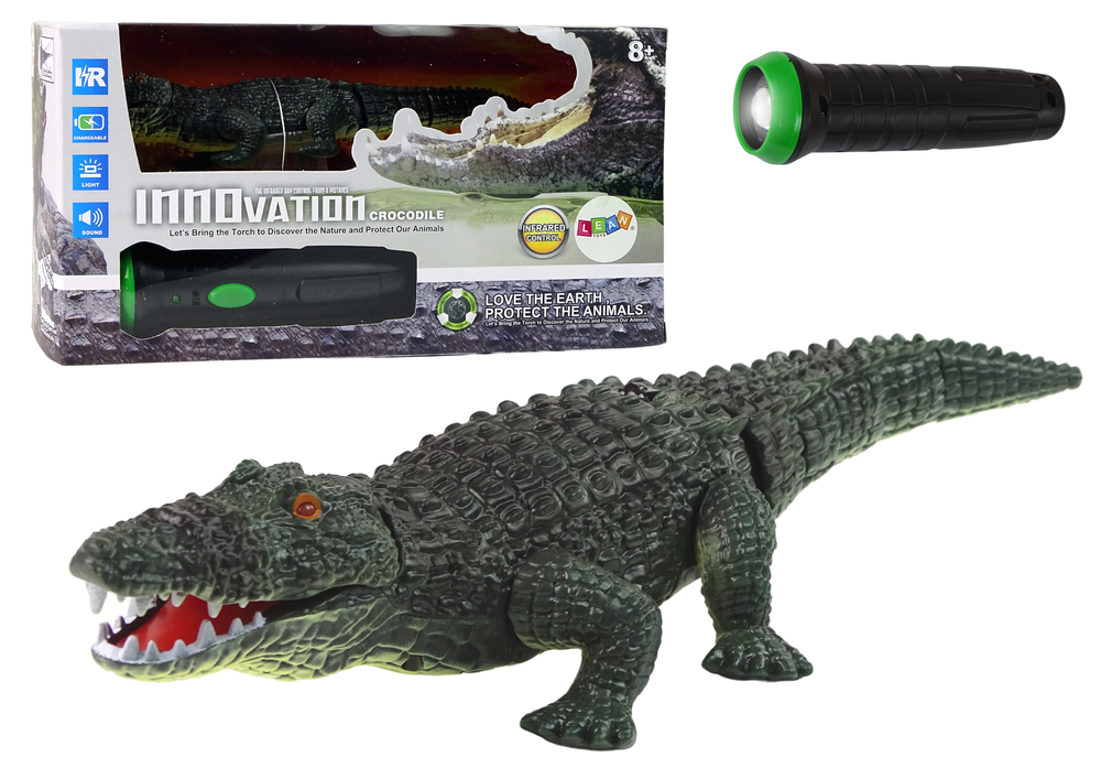 The remote control included in the kit looks like a torch. It has three buttons - front, back and control button. Here's a surprise! The crocodile reacts to the light and follows it, so the light is its remote control. A super toy for explorers of nature and the surrounding world.