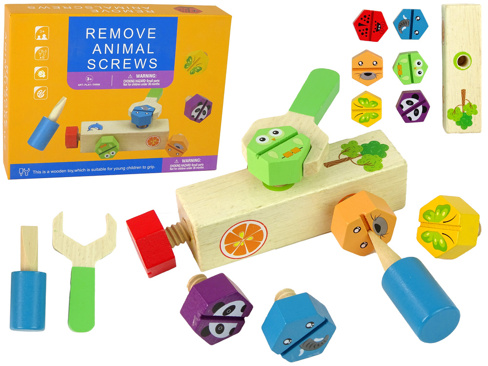 The entire DIY set consists of 9 wooden components. Entirely made of high quality natural wood, which guarantees the durability of the toy. Painted with non-toxic paints in strong expressive colours. The cheerful animal-like pictures will encourage your toddler to play and discover new skills. With the screws and spanner, you can twist or unscrew the screws while practising hand functions.
