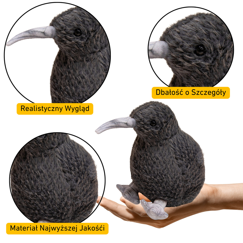 - Plush kiwi bird mascot, 17 cm, with realistic black plumage. Made of soft, pleasant to the touch material, it provides comfort when cuddling. Ideal as a cuddly toy and room decoration.