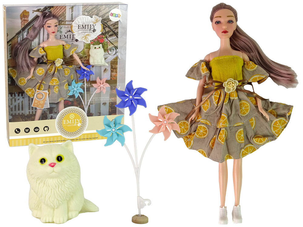 The Emily figure has an airy beautiful dress with an orange pattern, a belt with a flower and white shoes adding to her sporty style, she moves her arms and legs as well as her head. The doll has beautiful blue eyes and long hair. The cat makes squeaking sounds when pressed and her fur is white.