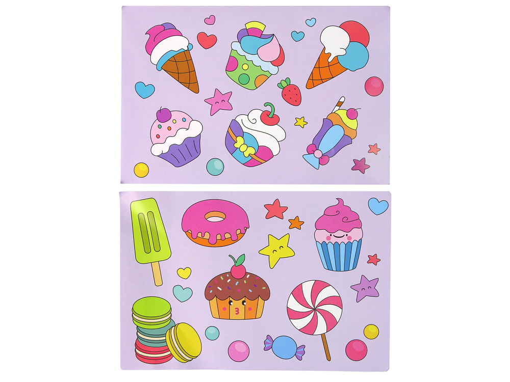 The set also includes 6 stained-glass ice cream and cupcake-shaped graphics, which we can stick onto the glass with special suction cups.
