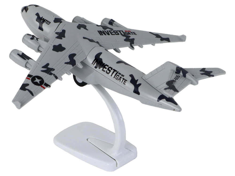 The plane is equipped with as many as four engines, which gives it the impression of a powerful machine ready for action. These details make the toy even more impressive and realistic.