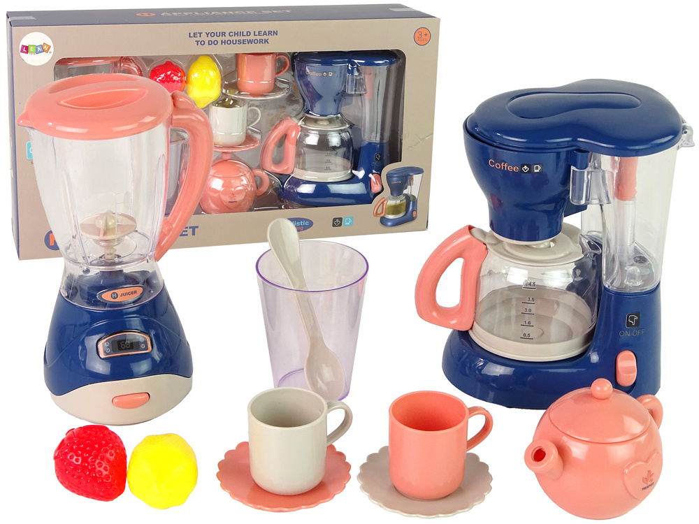 - A fantastic set of kitchen accessories for children with a passion for cooking. The 16 cm high coffee maker and blender provides sound and light effects. The set includes cups, plates, glass, spoon and decorations.