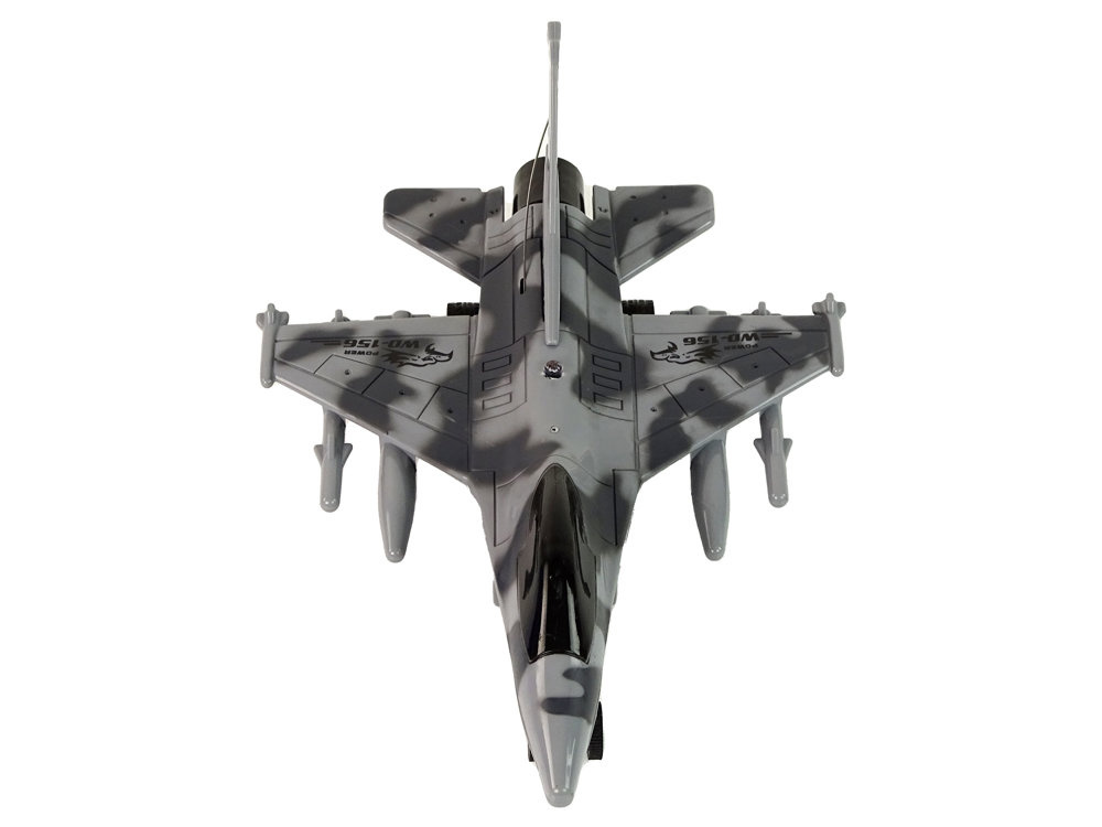 - The gray jet is an interactive toy with a realistic design and lights. Controlled with a remote control, it can move forward and backward and rotate while driving. The toy has dimensions: 23 cm x 10 cm x 16 cm.