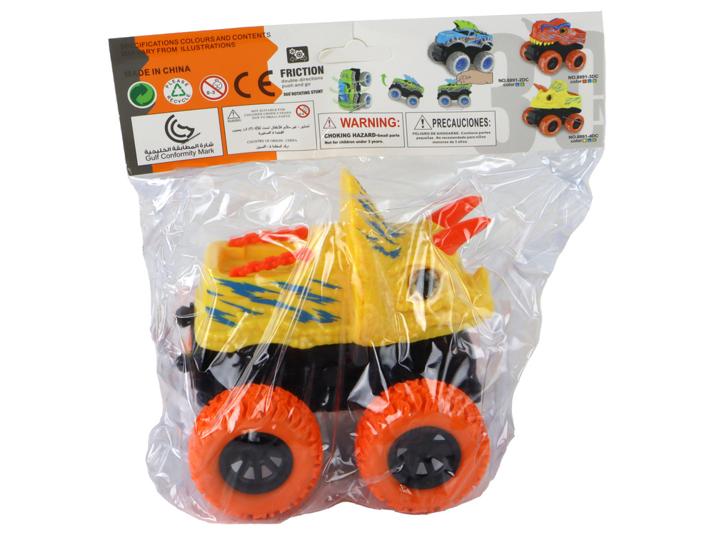 - It is a yellow vehicle in the shape of a dinosaur, equipped with large rubber wheels and a friction drive. It has realistic details and the whole thing is made of durable plastic. Its dimensions are: 13 cm x 12 cm x 11,5 cm.