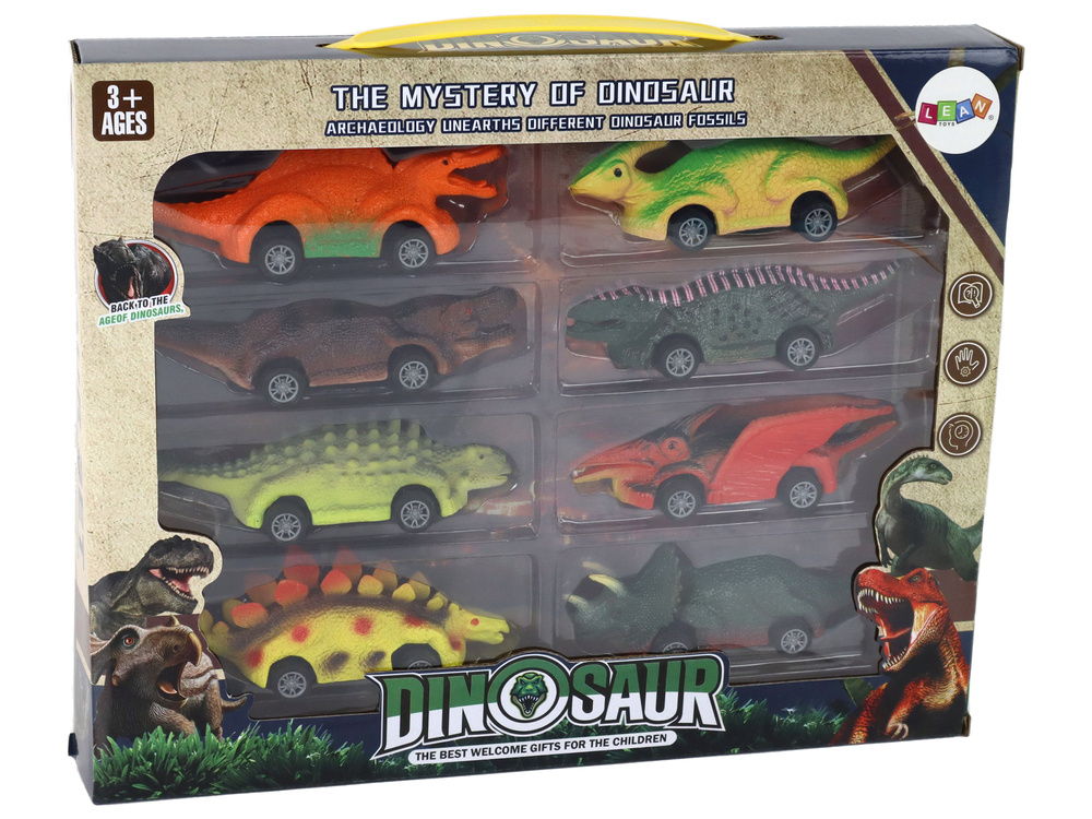 - A set of 8 dinosaur cars is colorful and educational fun. Faction drive, unique dinosaurs in different colors. Develop your imagination!