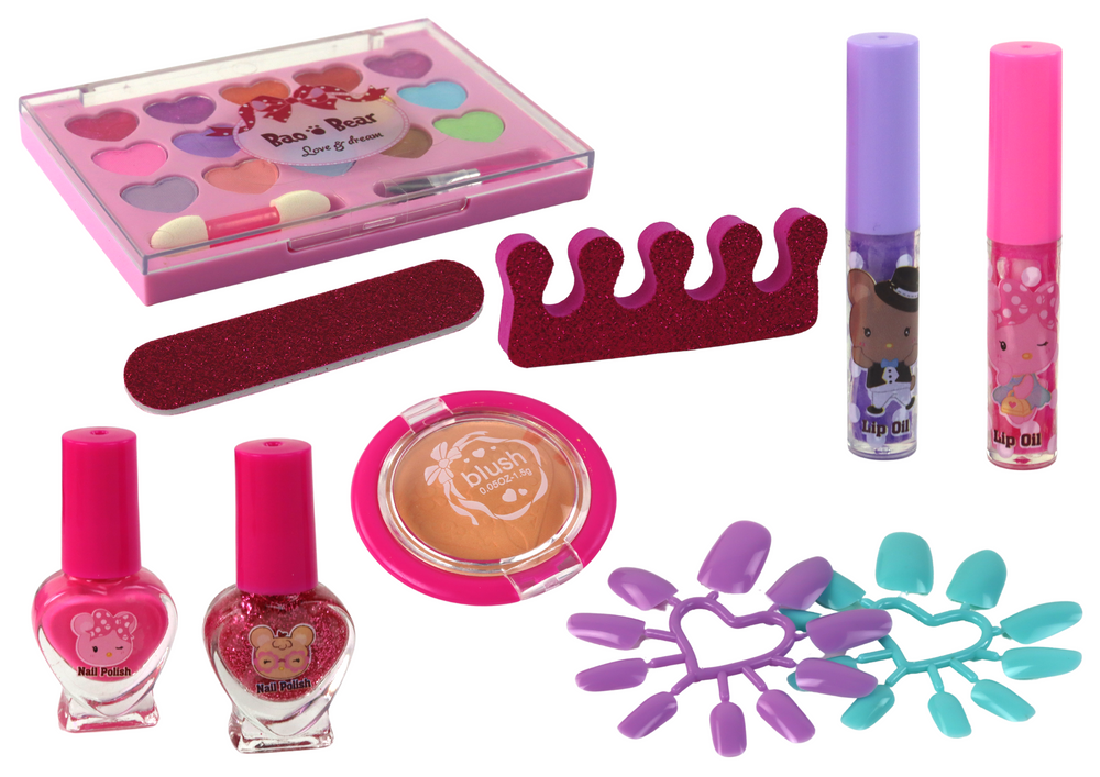 - A pink suitcase full of magic for little makeup artists. Contains eye shadows, powder, nail polishes, stickers, lip gloss, rings and a cute mirror. A perfect gift for developing creativity and attention to detail.