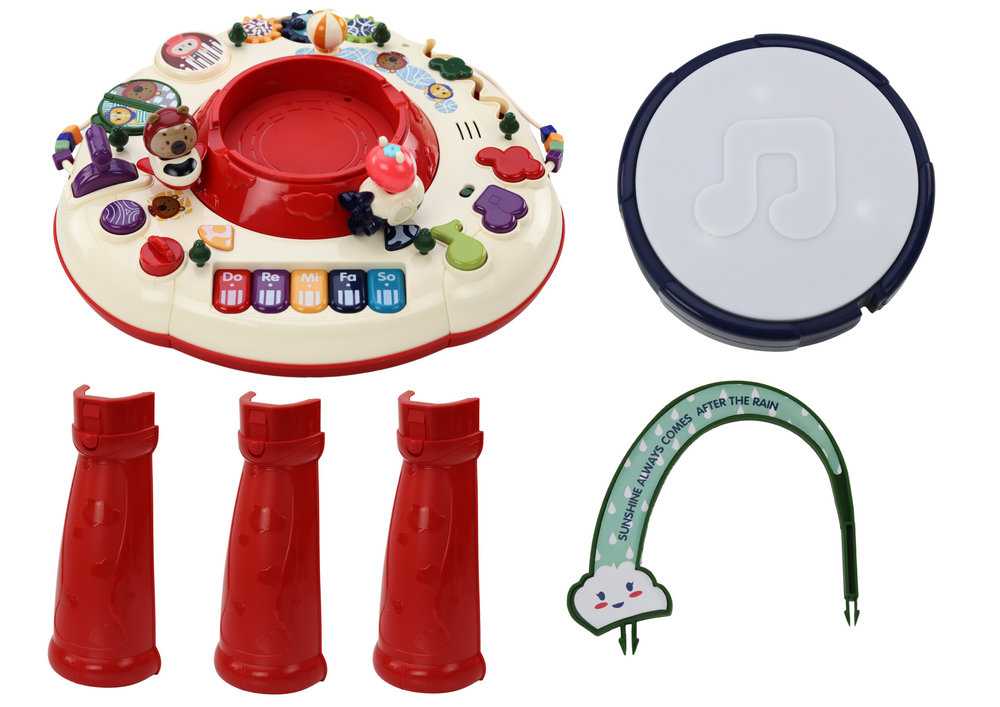 A puzzle with four figures in four different colors develops the child's manual and logical skills, stimulating his creativity and concentration. At the very top of the table there is a drum around which animals spin, which adds an element of movement and interest.
