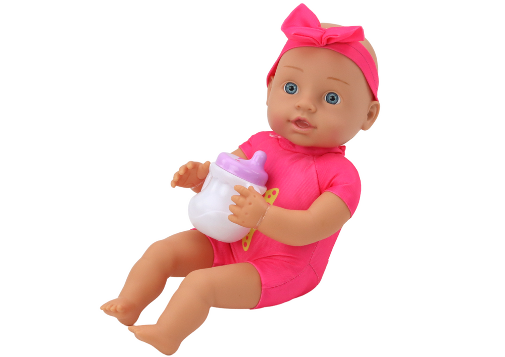 - Adorable baby doll! In a pink outfit with a beautiful pink headband with a bow and a yellow star. The set includes not only this adorable doll, but also practical accessories such as a bowl with a spoon and fork and a bottle.