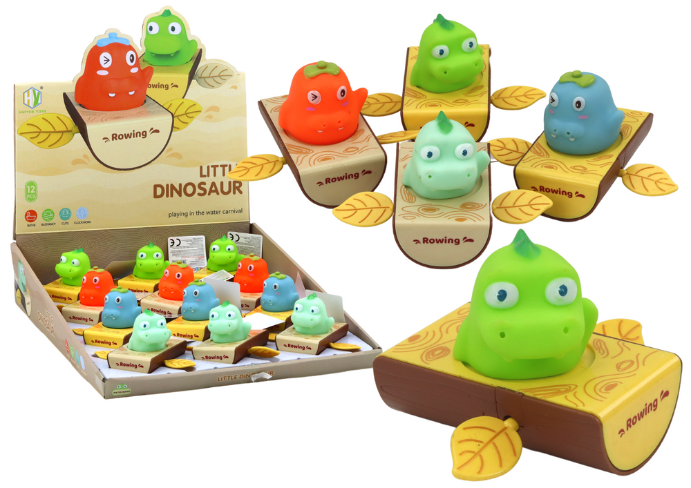 - The bath toy - a dinosaur in a boat, is an ingenious toy that winds up from the bottom and then floats thanks to two leaf paddles. Joyful and imaginative fun for kids.