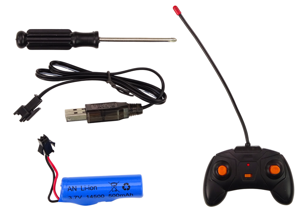 The car is powered by a 3.7V 500mAh battery, which is part of the set. A charger is included with the battery.