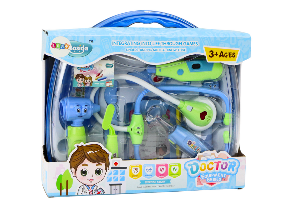 - The doctor set in a blue suitcase is an educational toy containing a stethoscope with light and sound effects, a thermometer, a syringe, scissors, a patient card and other medical accessories. A practical suitcase makes storage and transport easier.