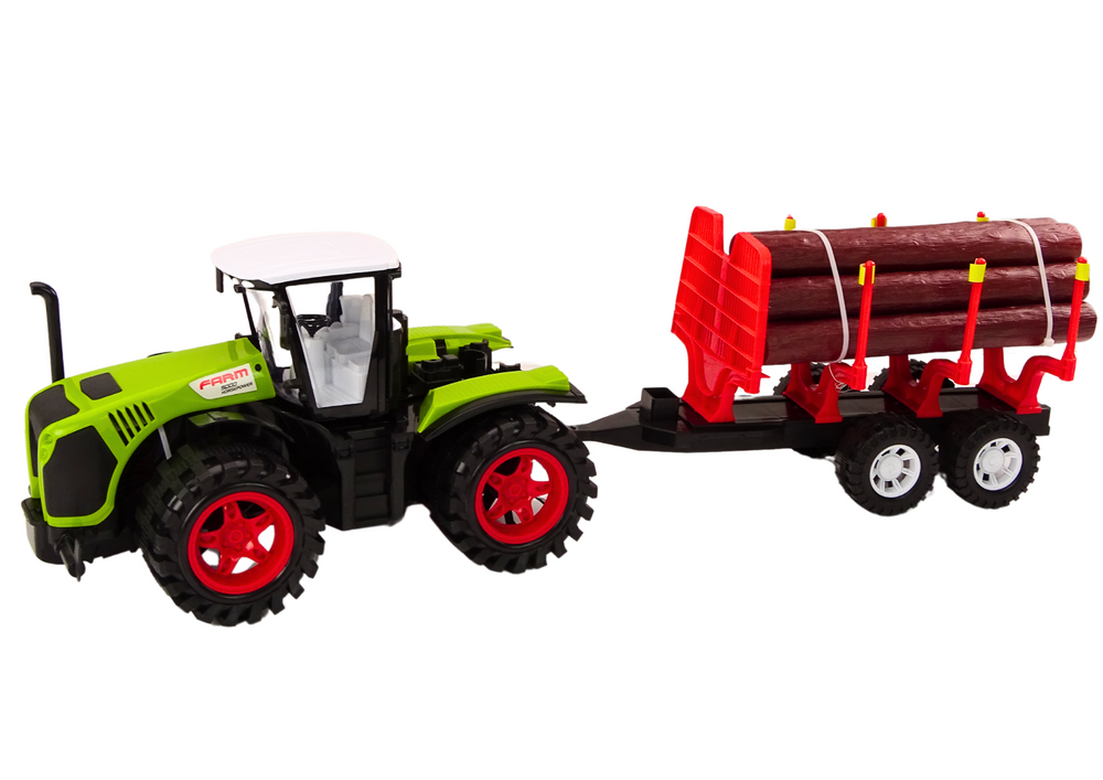 - The large farm tractor with a tree trailer is a solid toy with 9 logs of wood. Made of safe materials, it allows children to load and unload realistically, developing their imagination and motor coordination. Perfect for little farming enthusiasts.
