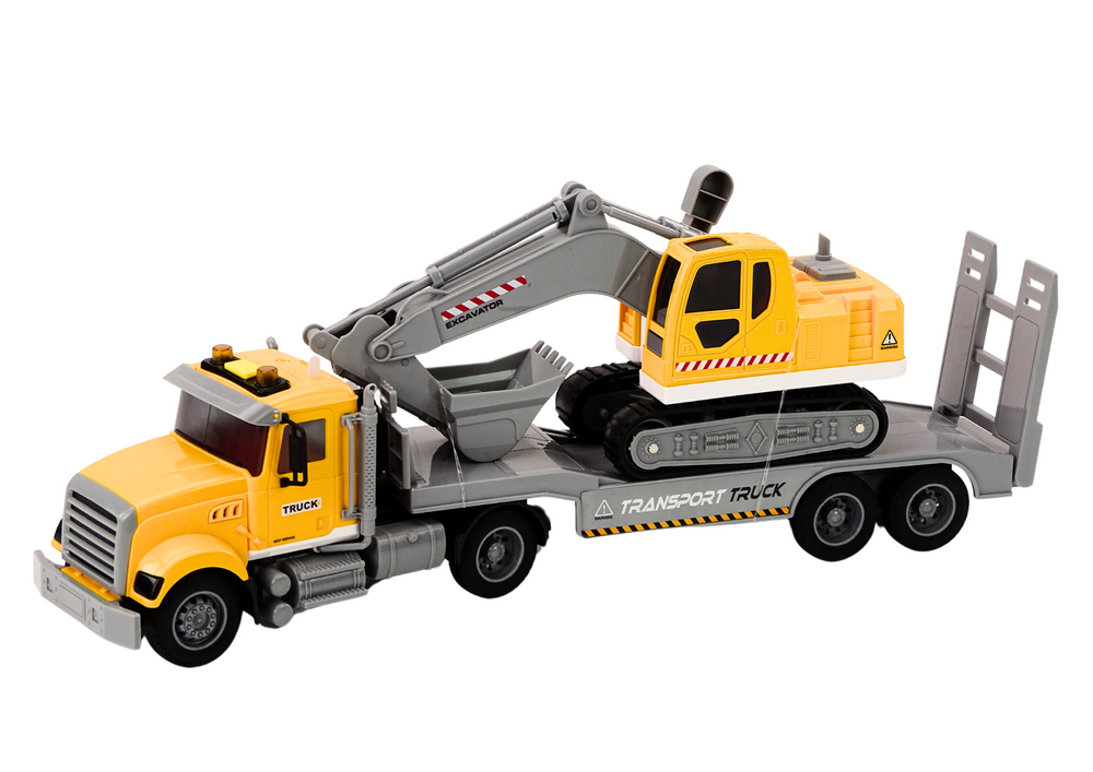 - The yellow Lora truck with a crawler excavator offers realistic fun with light and sound effects. The excavator has a steerable bucket and a rubber drive, and the truck has a friction drive, which adds dynamics and develops the child's imagination.