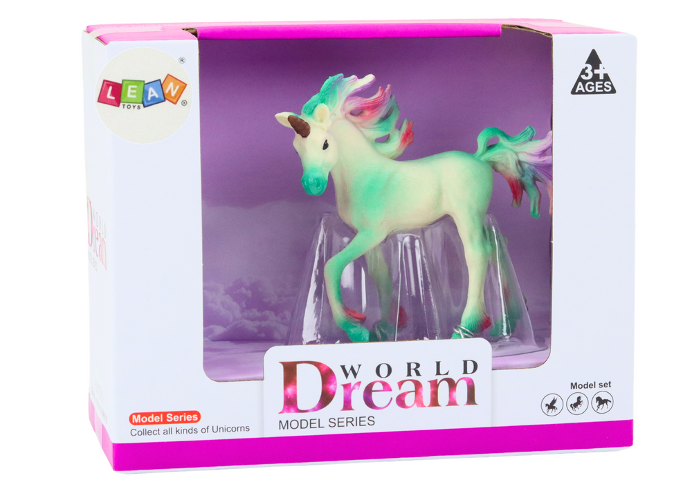 - A green unicorn figurine with a colorful mane and tail, made of solid and durable material, delights with realistic details. It can be an element of fun, a charming decoration for a child's room or a valuable element of a collection.