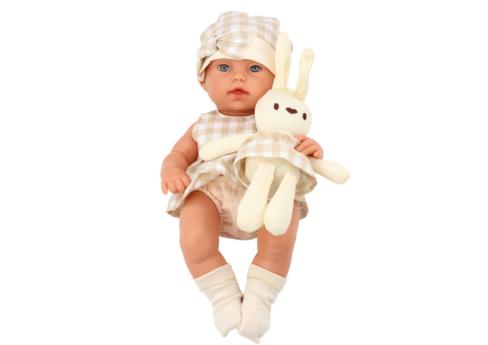 Baby doll in a carrier, a bunny, in a checkered outfit, beige