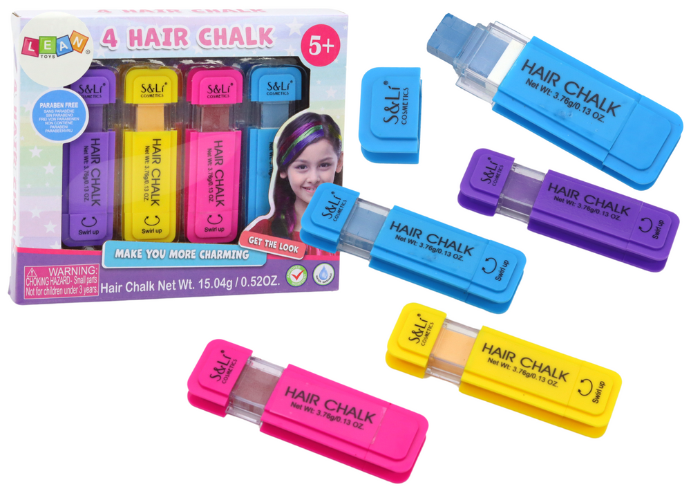 The set contains as many as four dyeing chalks, which allows for even greater variety in creating hairstyles. The speed and ease of changing hair color mean that every child can change their appearance in a few moments and feel like a real stylist. It's not only fun, but also a way to develop children's imagination and creativity.