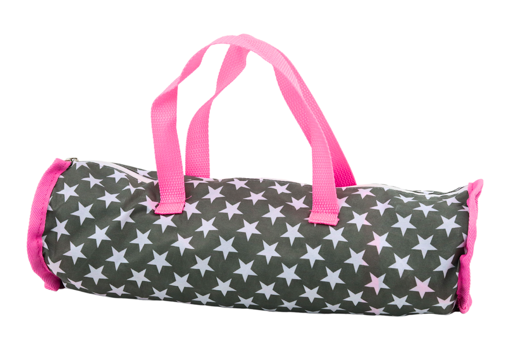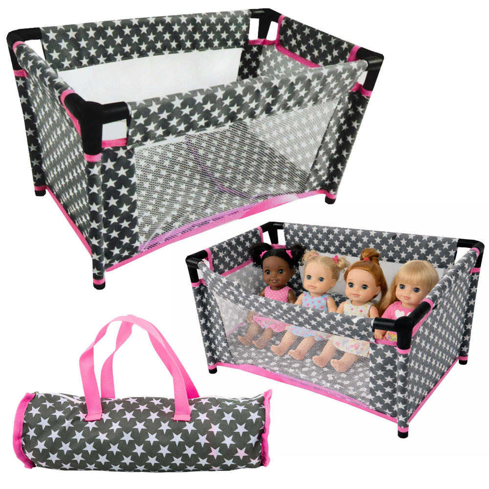 - Doll bed in grey. Frame made of aluminium tubes with plastic joints, mesh sides, grey with white stars and pink elements. Blanket and pillow included. Easy to dismantle and carry.