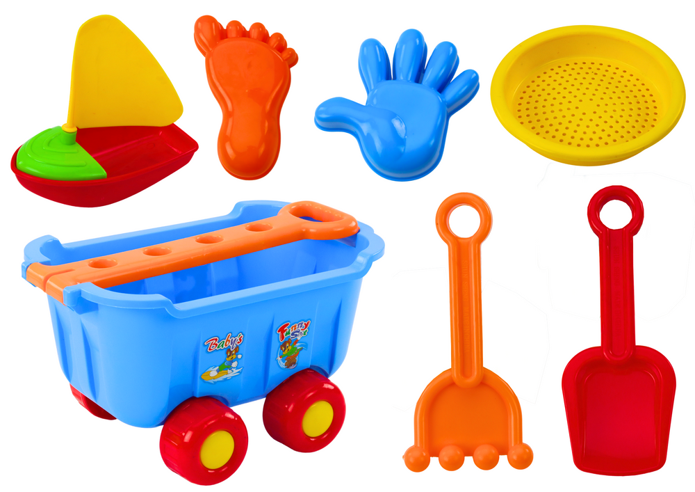 - The sand toy set includes a blue trolley on wheels with a comfortable handle, a rake, a shovel, a strainer, a boat and two molds. Perfect for creative play on the beach or in the sandbox, made of safe, durable materials.
