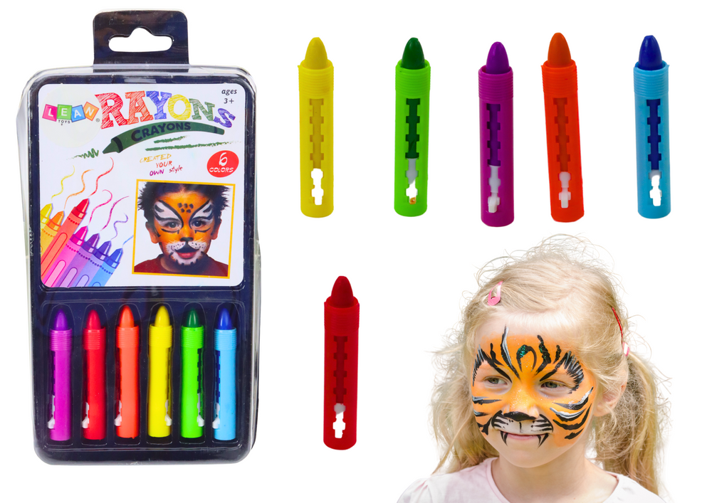 - The set of face painting crayons contains 6 twistable, non-toxic crayons, safe for children's skin. Easy to use, intense colors stimulate the imagination. Perfect for parties and everyday fun, easy to wash off with soap and water.