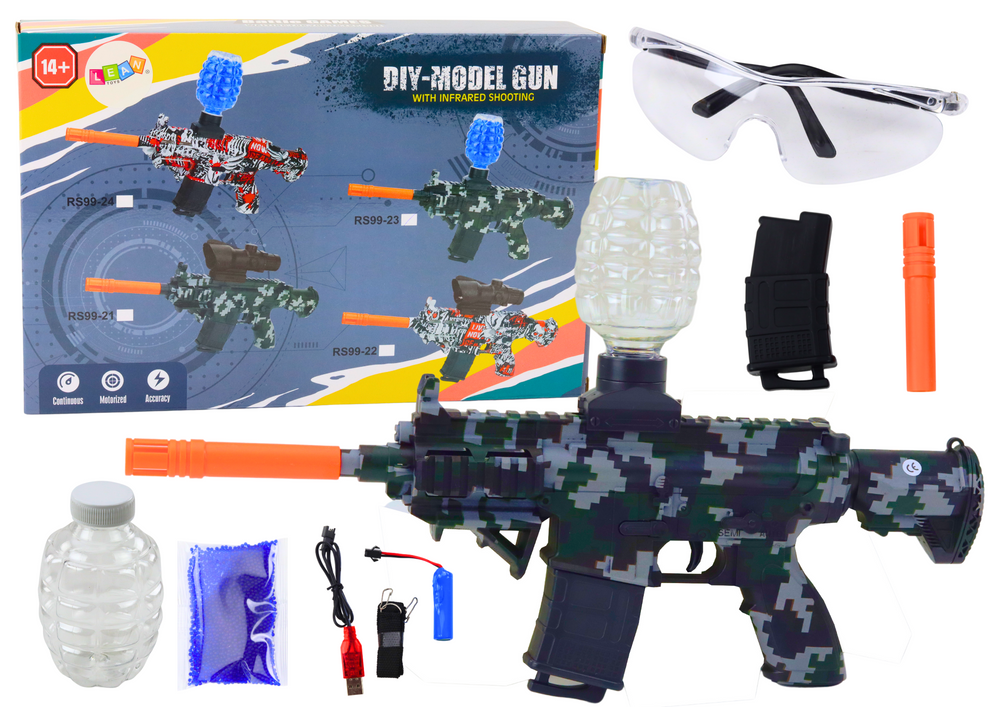 - An advanced rifle with a 600-round magazine and a range of up to 15 meters. Supports 7-8mm balls. Offers automatic and single modes. The set includes a belt, safety glasses, removable magazine, lightweight construction.