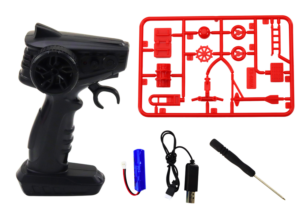 The boat is controlled by a 3.7V 600mAh battery, which is part of the set. A charger is included with the battery.
