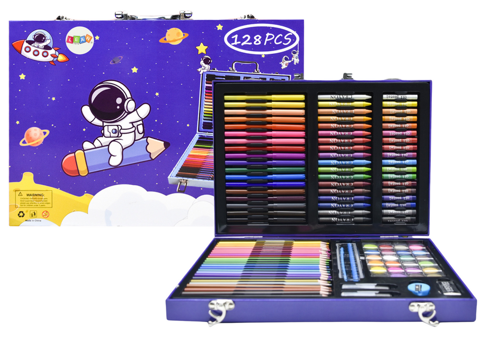 - The 128-piece art set in a blue astronaut-themed case contains everything a little artist needs. Perfect for developing creativity and imagination.