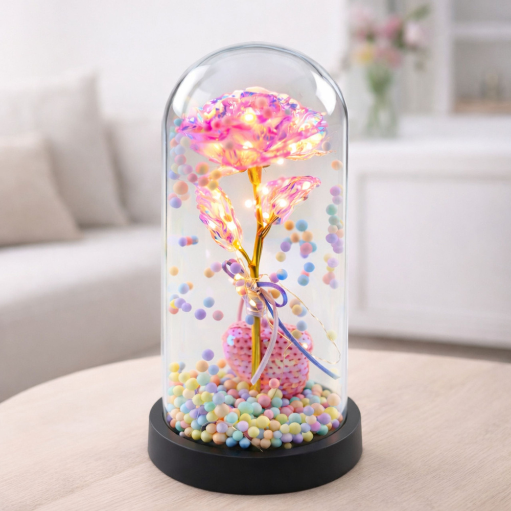 The eternal crystal rose in pink, adorned with a heart and colorful beads, placed in an elegant dome with subtle LED lighting, is a unique and symbolic gift that adds an unforgettable character to any room. The soft LED light creates a magical atmosphere, perfect for romantic occasions.
