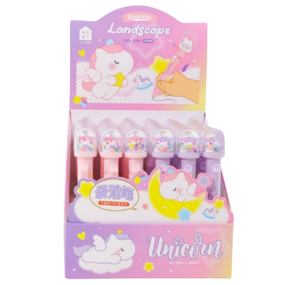 - A charming pen with a figurine and moving glitter is a perfect addition to a school set for children and young people. Pastel colors, fairy-tale motifs and a transparent dome with moving elements.