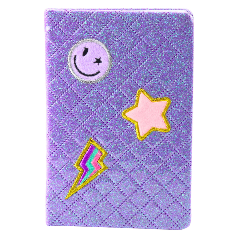 A6 GLITTER PURPLE LINED NOTEBOOK, 80 PAGES WITH PATCHES