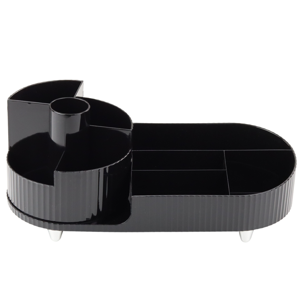 - The elegant, rotating organizer in black is a universal and functional solution that will work perfectly in both the bathroom and on the desk. Thanks to its well-thought-out design and practical compartments, it allows for convenient storage.