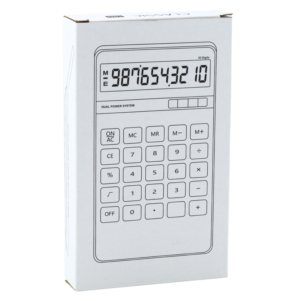 - A modern office calculator in an elegant, white casing is a combination of aesthetics and functionality. The minimalist design and clearly marked buttons make the device look great on any desk.