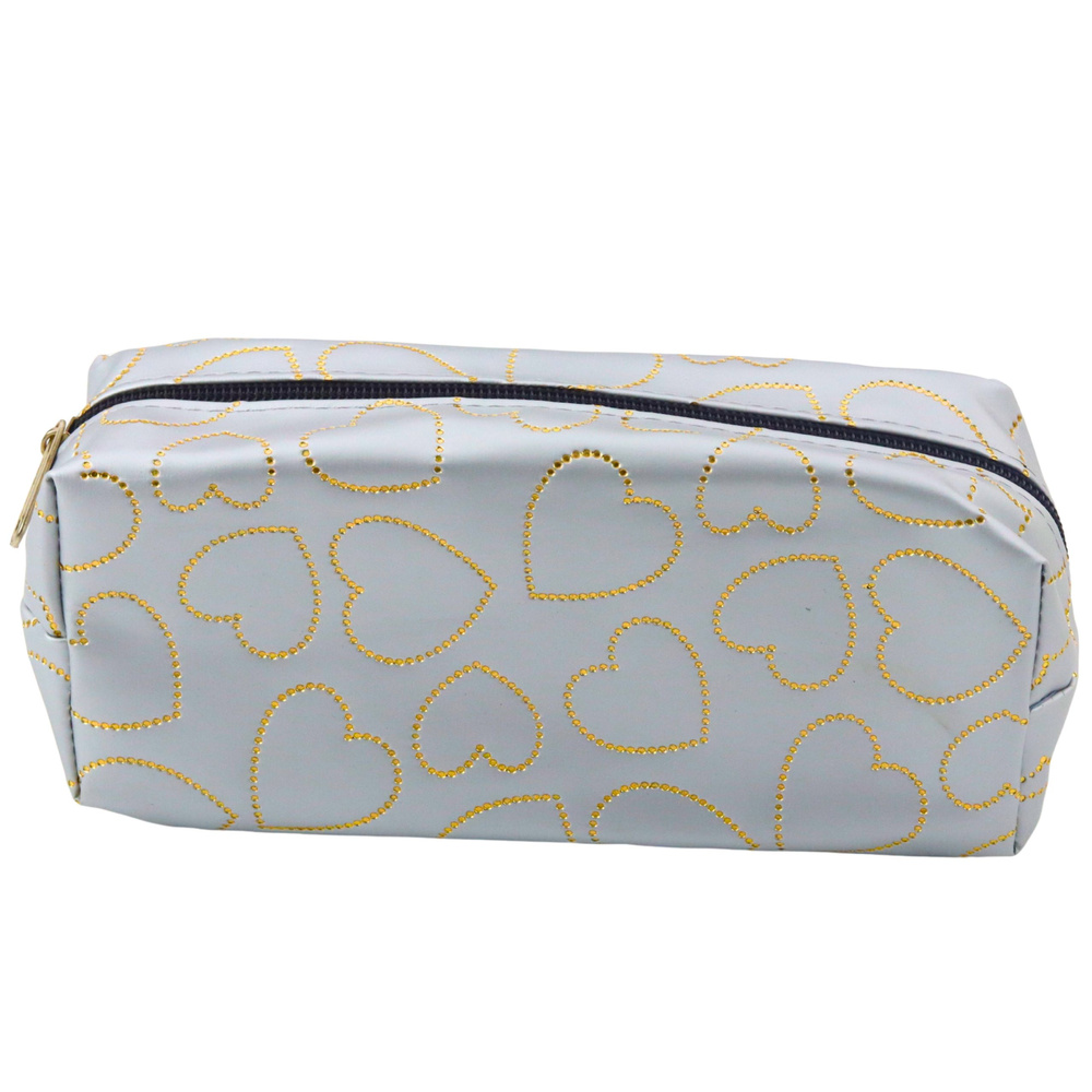 - A stylish and functional pencil case in an elegant silver color, decorated with a subtle pattern of gold hearts, is a perfect choice for pupils, students and anyone who appreciates practical accessories with a fashionable accent.