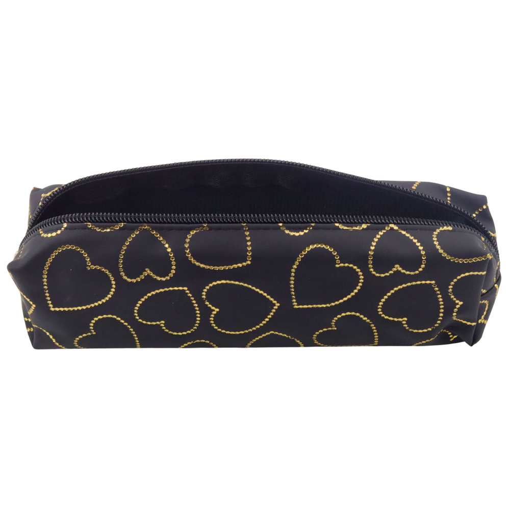 - This black pencil case with gold hearts is a stylish and practical accessory perfect for school, university, or the office. Its compact size and lightweight design make it an excellent choice for storing essentials.