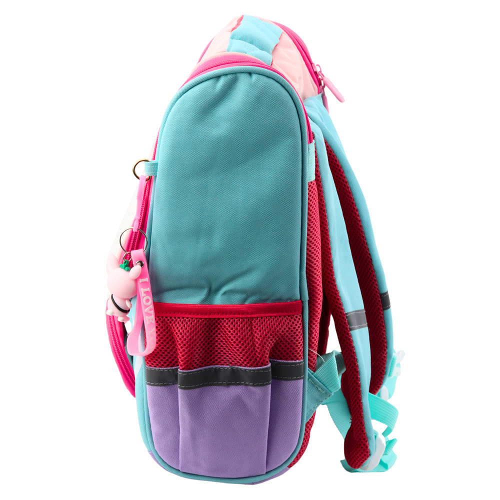 The backpack has one large main compartment, which provides enough space for books, notebooks and other school accessories. On the front there is a detachable bag with a bird, which can be used as a separate case or decoration. Additionally, a pendant with a cute bunny is attached to the zipper.