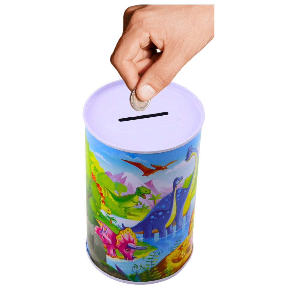- Metal piggy bank with colorful dinosaur motif is a great way to teach saving for the youngest, combining functionality and attractive appearance. Made of solid metal, it is resistant to damage and everyday use.