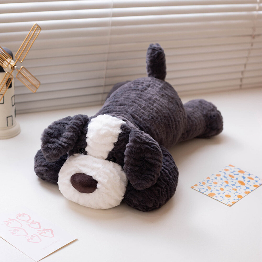 - The dark gray plush dog is a charming and exceptionally soft cuddly toy that will surely become the best companion for every child. Made of an extremely delicate and pleasant to the touch material.