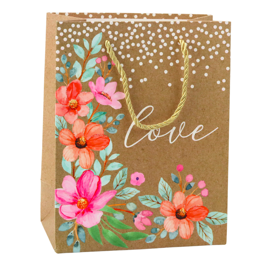 - A unique gift bag with a natural, rustic look is a great choice for a loved one for various occasions. The bag stands out with a subtle combination of beautiful, colorful flowers and the inscription "Love"
