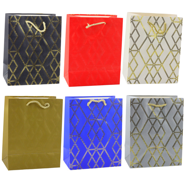 - Stylish gift bag with geometric pattern of gold, shiny lines is a perfect choice for any special occasion. Its minimalistic, yet luxurious design gives the gift a prestigious look.