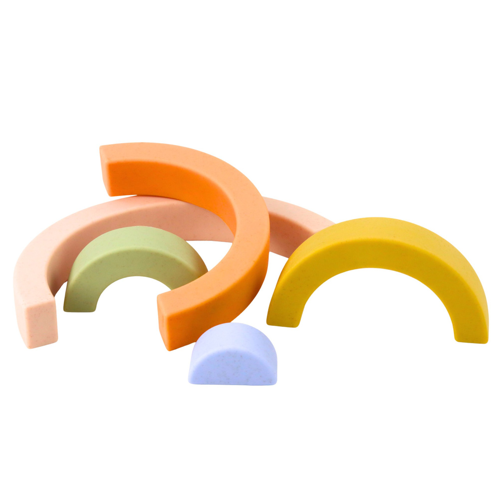 - This pastel rainbow of rubber blocks is a unique sensory toy that develops creativity, motor coordination, and manual dexterity in children. The set consists of five pieces in various sizes that can be arranged and matched freely.