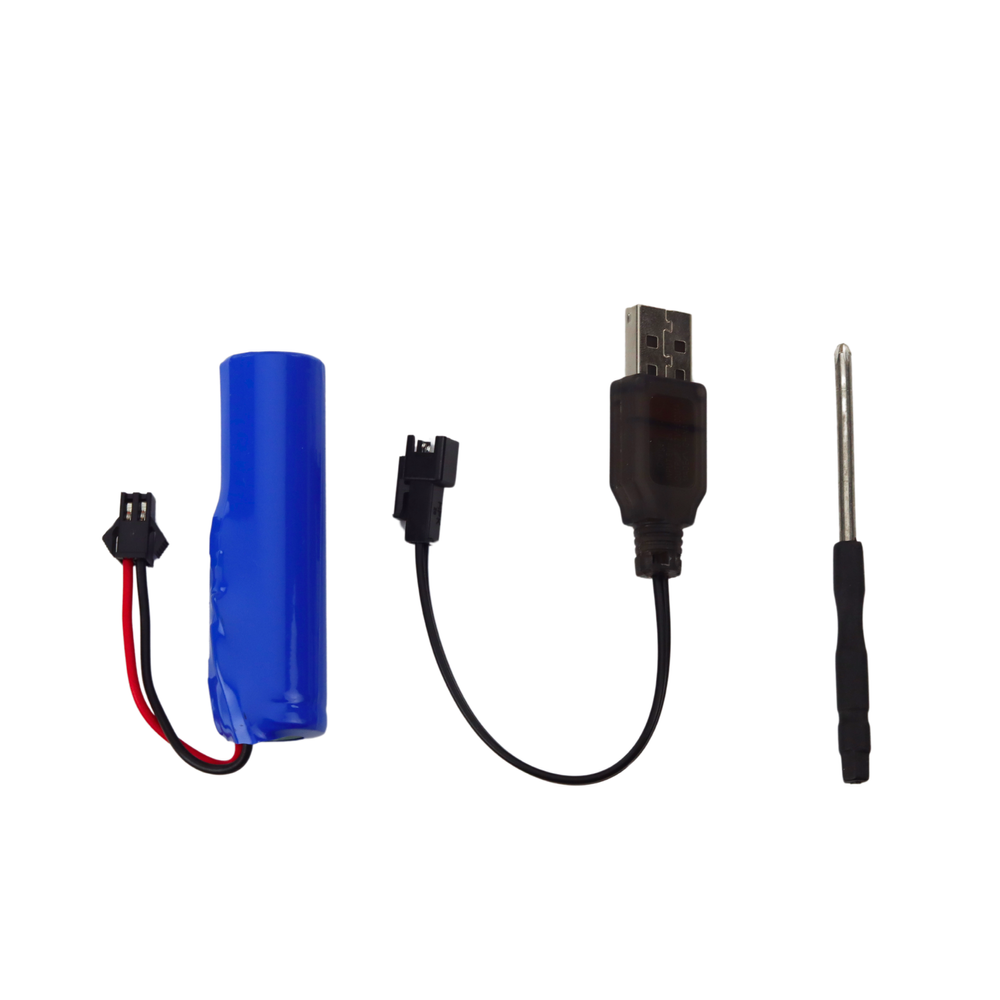 The gun is powered by a 3.7V Li battery, which can be easily charged using the included USB cable. The set also includes a screwdriver that allows easy access to the battery compartment - everything you need to start playing immediately after unpacking.