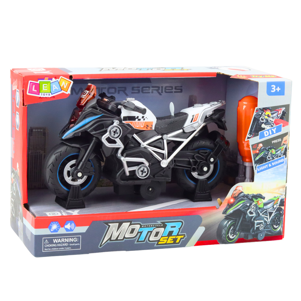 The black racing turning motorcycle is a modern construction toy that combines a dynamic, sporty look with an educational function, providing the child not only with entertainment but also with valuable learning through play. Designed with the youngest motoring enthusiasts in mind, the motorcycle allows for independent assembly and disassembly of elements using the included screwdriver with two replaceable tips, which develops logical thinking, technical skills and hand-eye coordination.