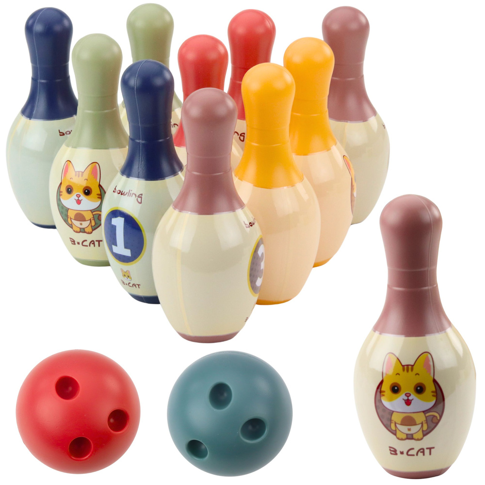 - This colorful bowling set for kids is a great way to engage in active and fun play while developing coordination, accuracy, and concentration. The set includes 10 lightweight, numbered bowling pins with adorable kitten motifs and two bowling balls.