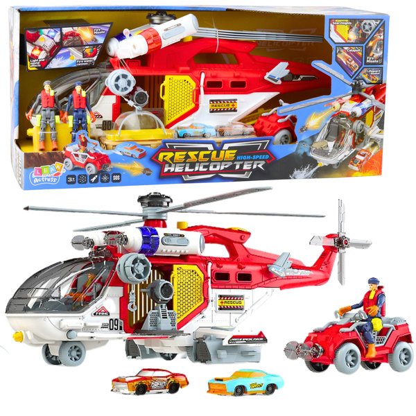 - Rescue helicopter with light and sound effects, equipped with a winch with basket, water sprayer, vehicle ramp and car launching function. Everything you need for an exciting rescue operation!