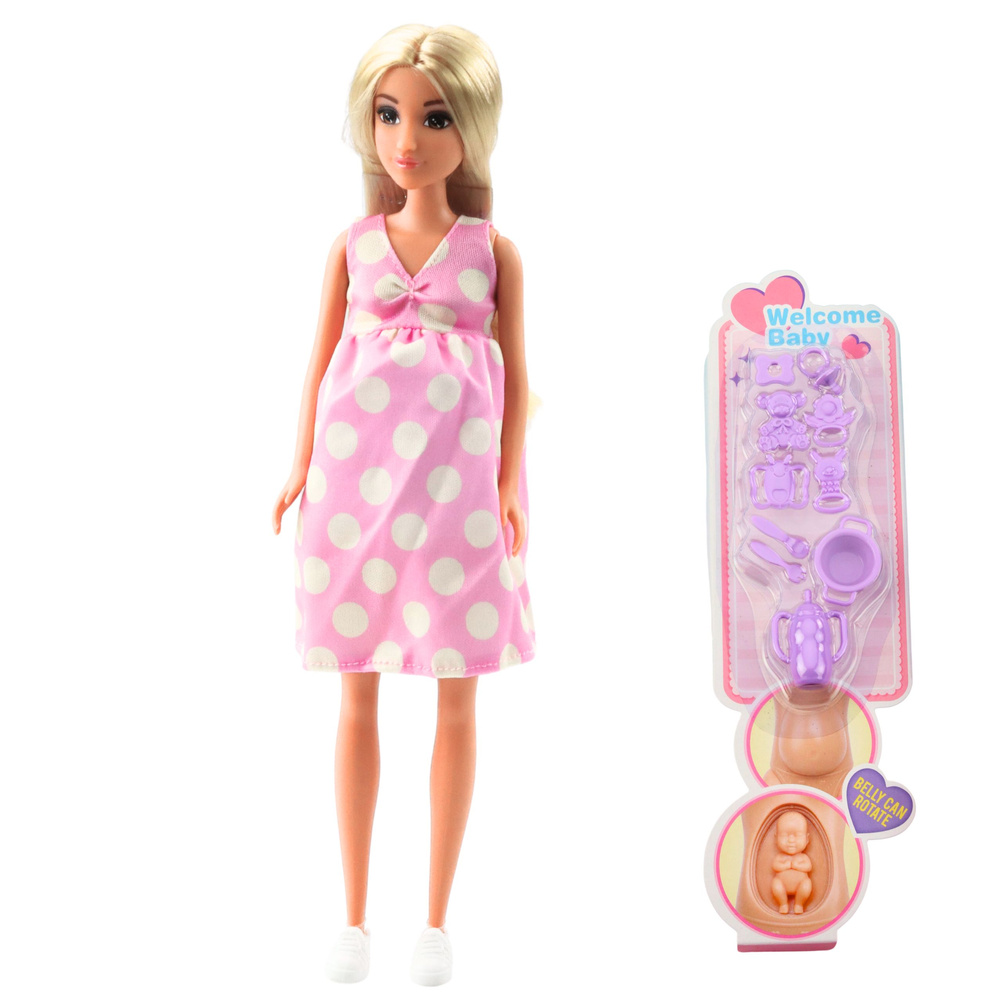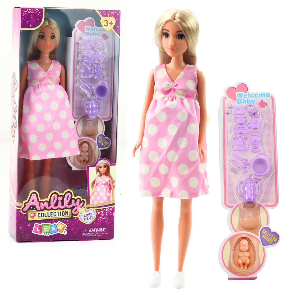 - This pregnant doll is a unique toy that allows children to role-play scenarios related to motherhood and caring for an infant. Dressed in a pink dress with white polka dots, it looks incredibly elegant and captivating. The biggest attraction is the movabl