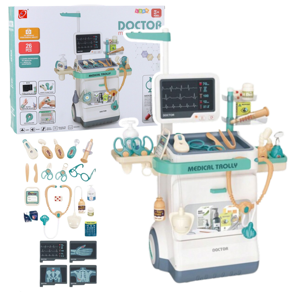 - The Doctor on a Medical Cart Set is a unique educational toy that allows children to role-play as a doctor and learn about basic medical tools. Thanks to the large number of pieces – as many as 26 accessories – your little one can perform tests.