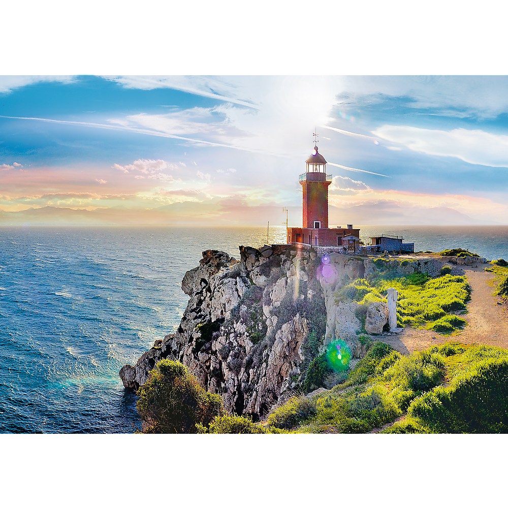 A 1000-piece puzzle depicting the lighthouse in Melagavi, Greece. Once assembled, a 68x48 cm image will be created. High quality, color saturation, and safe assembly are ensured by calendered, light-reflecting paper covered with ecological food paints.